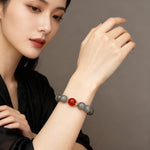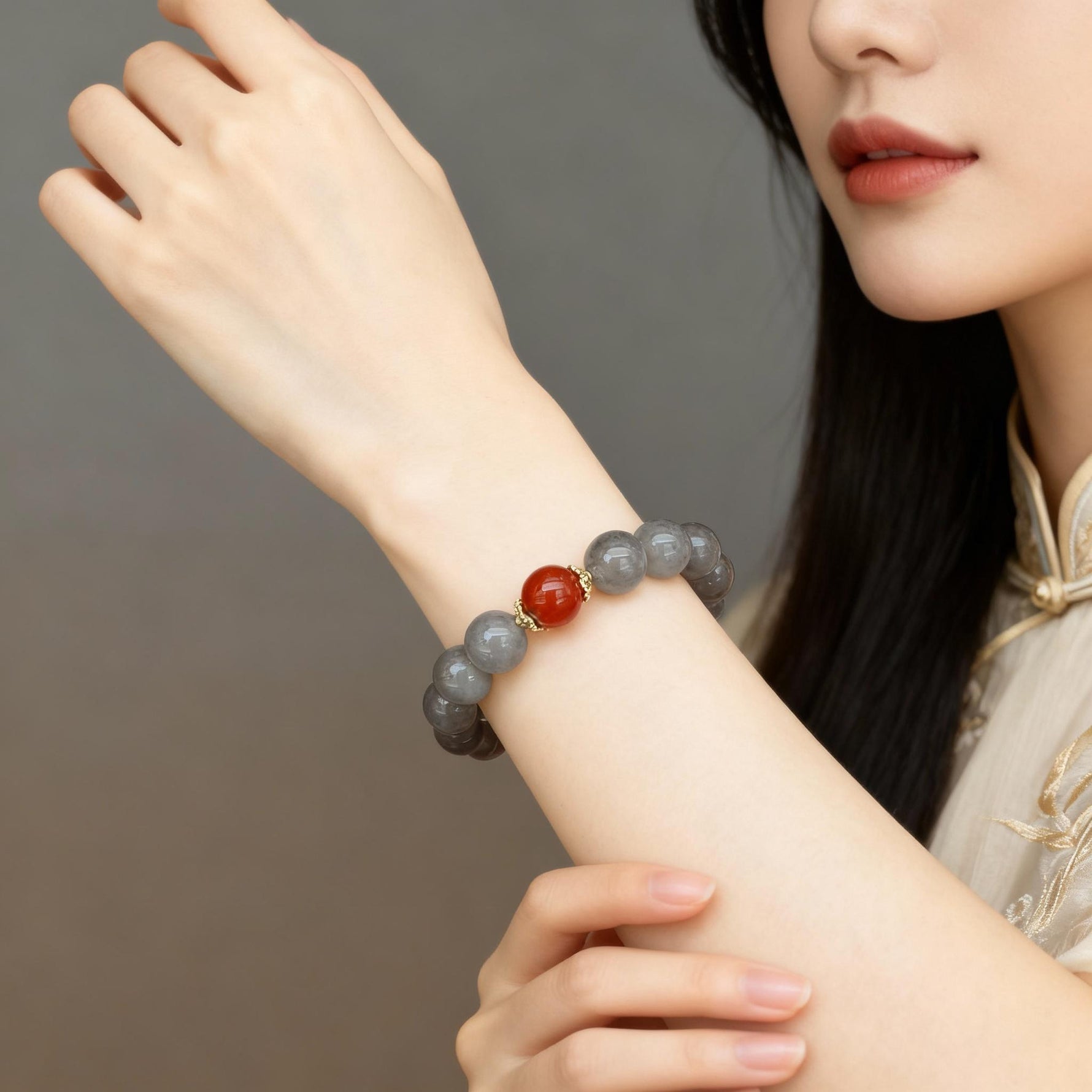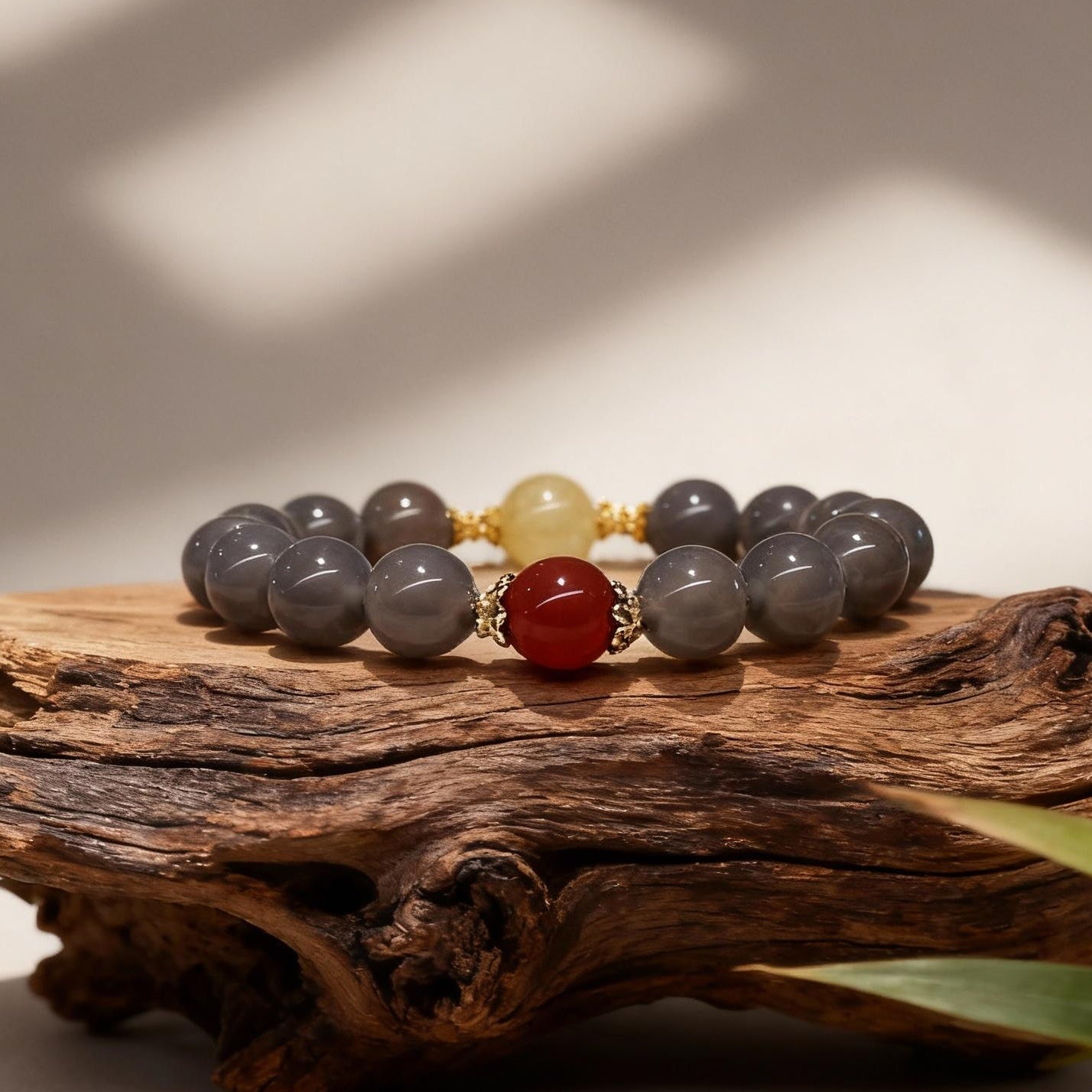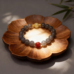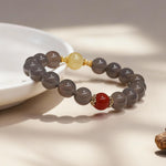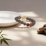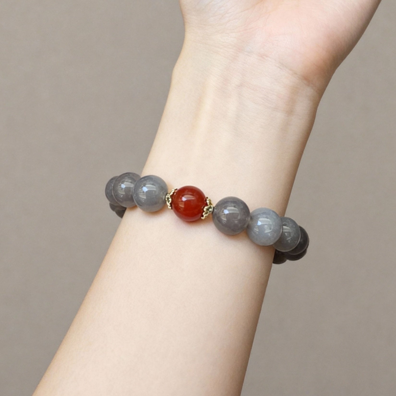 Designed for versatility, the bracelet blends earthy elegance with bold contrasts. Smooth Gray Chalcedony beads exude understated sophistication, while the oversized Golden Rutilated Quartz commands attention with its golden "hair" shimmer. The deep crimson Red Agate adds a pop of passion, creating balanced asymmetry. Delicate brass spacers add subtle texture, and it’s strung on elastic cord for flexibility, fitting wrists 6–8 inches effortlessly.