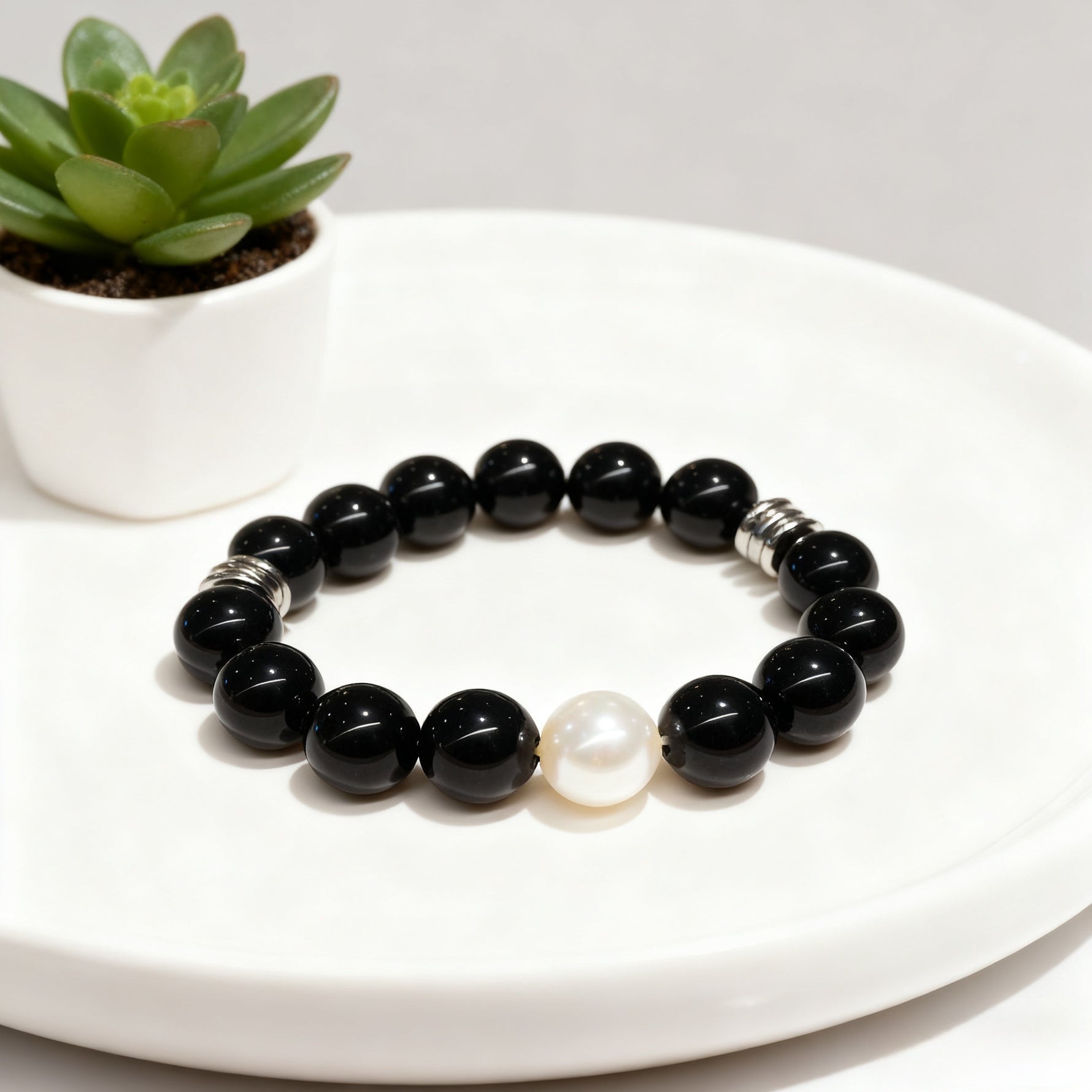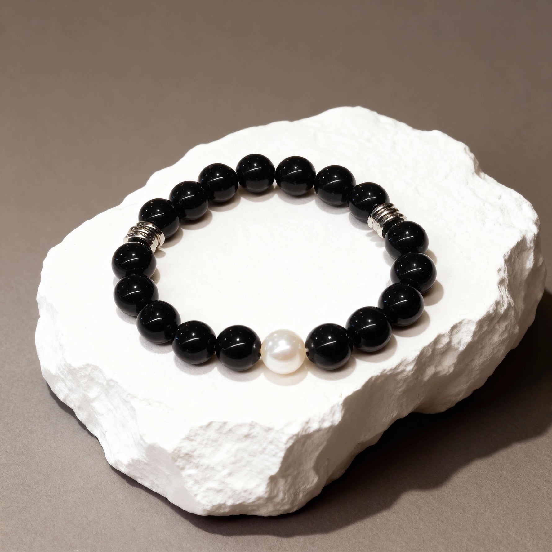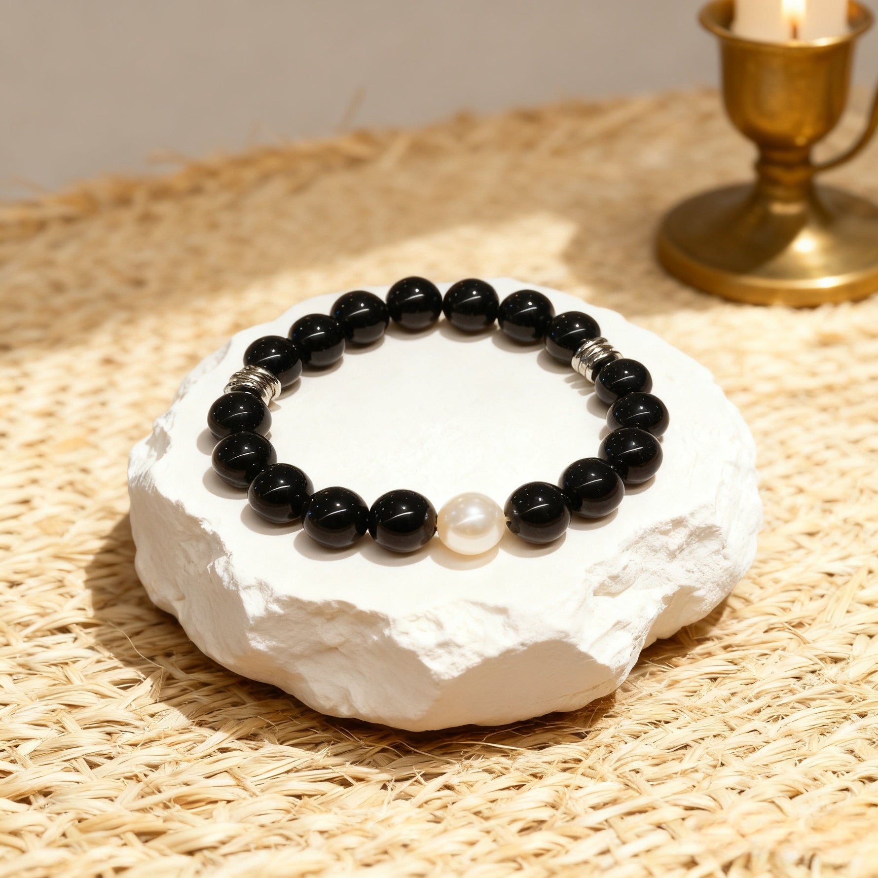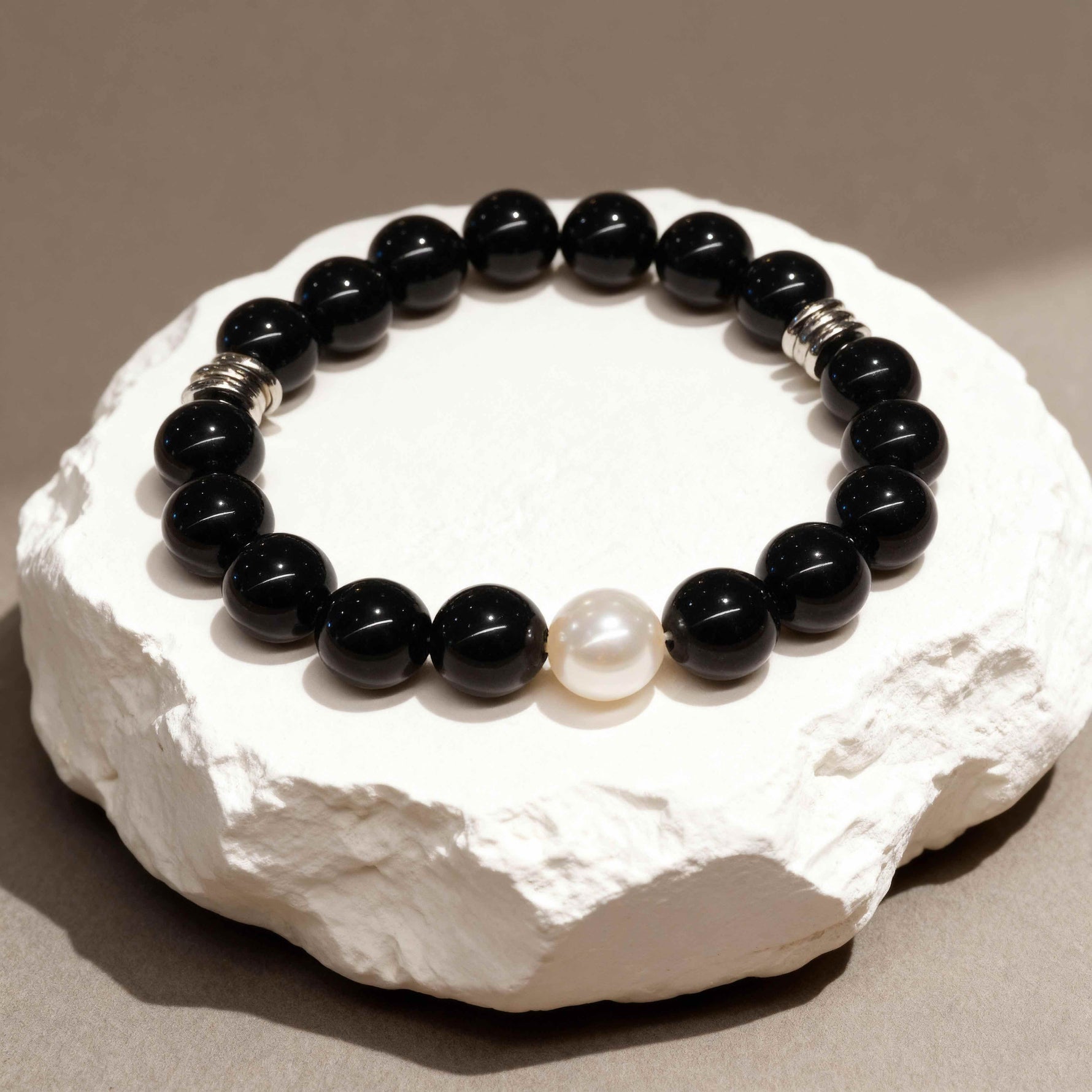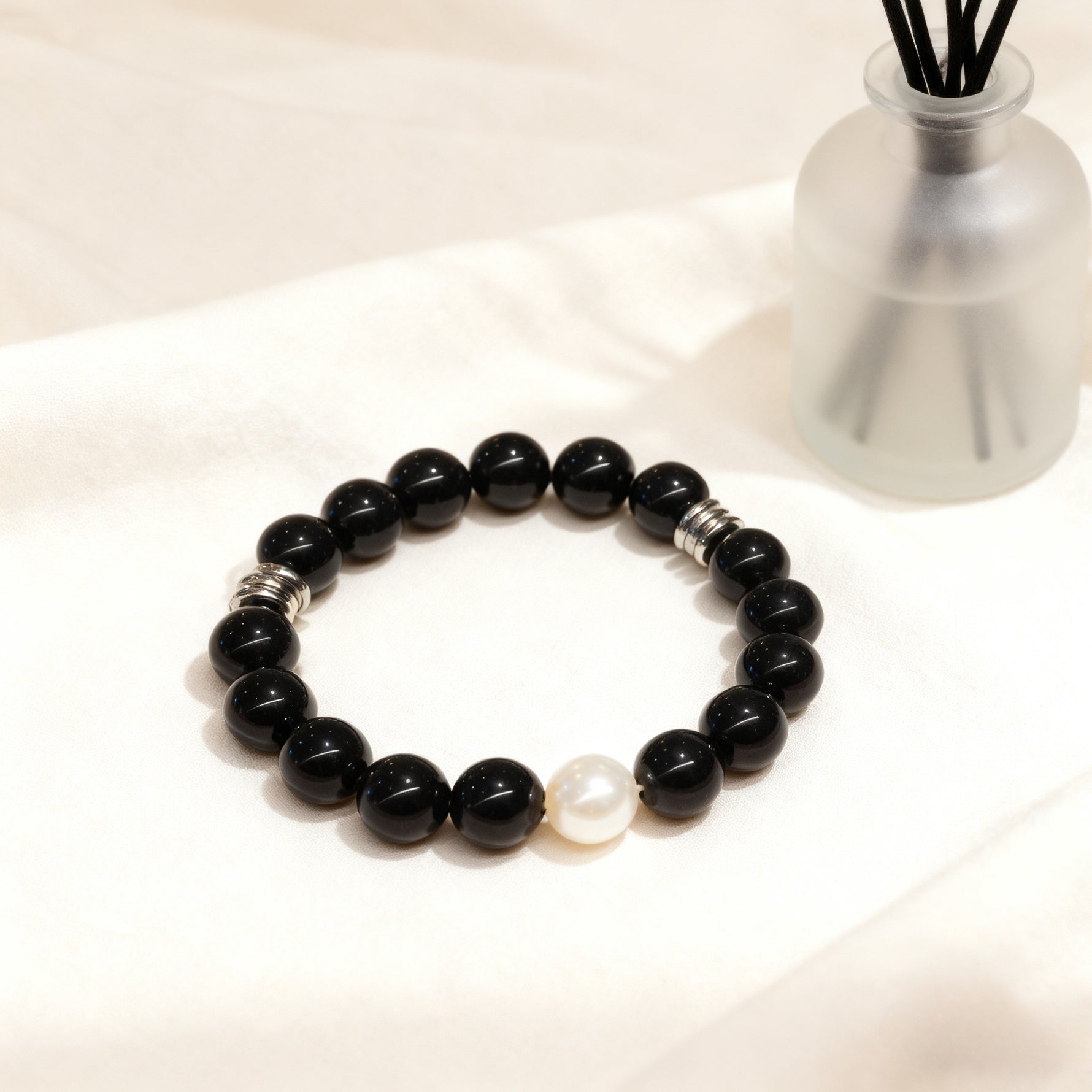 By combining Obsidian and Pearl, this bracelet creates a harmonious blend of protection and elegance. Obsidian deflects negativity and grounds your energy, while Pearl soothes emotions and infuses your style with refined calm. Together, they empower you to navigate daily life with confidence, protection, and a touch of timeless sophistication.