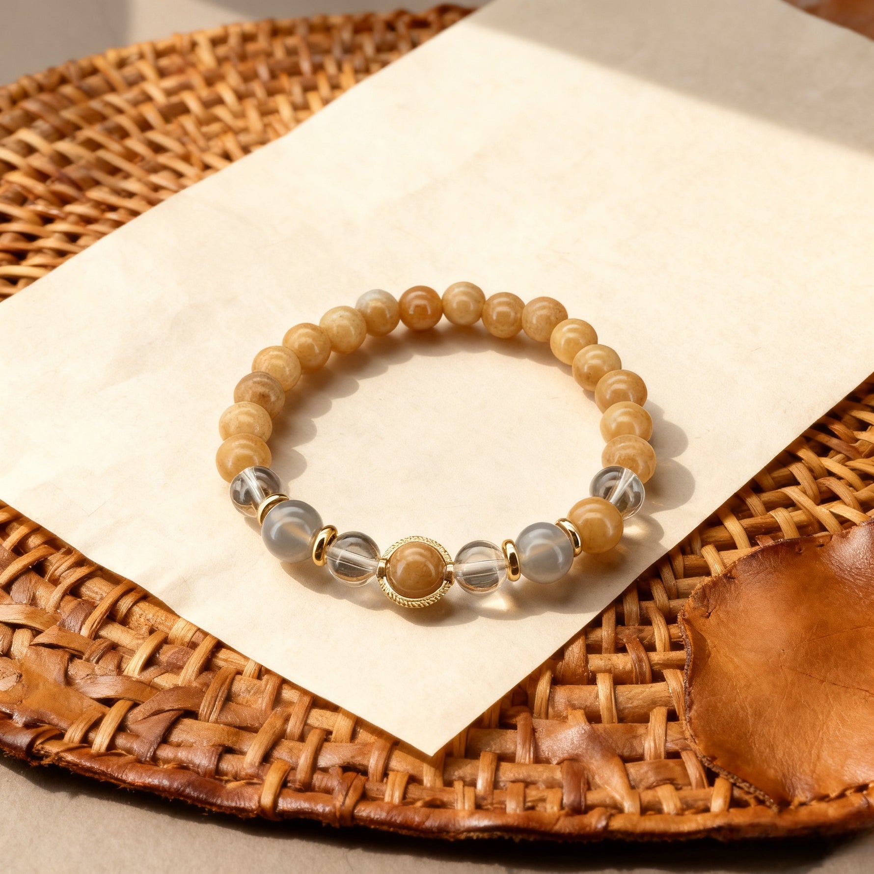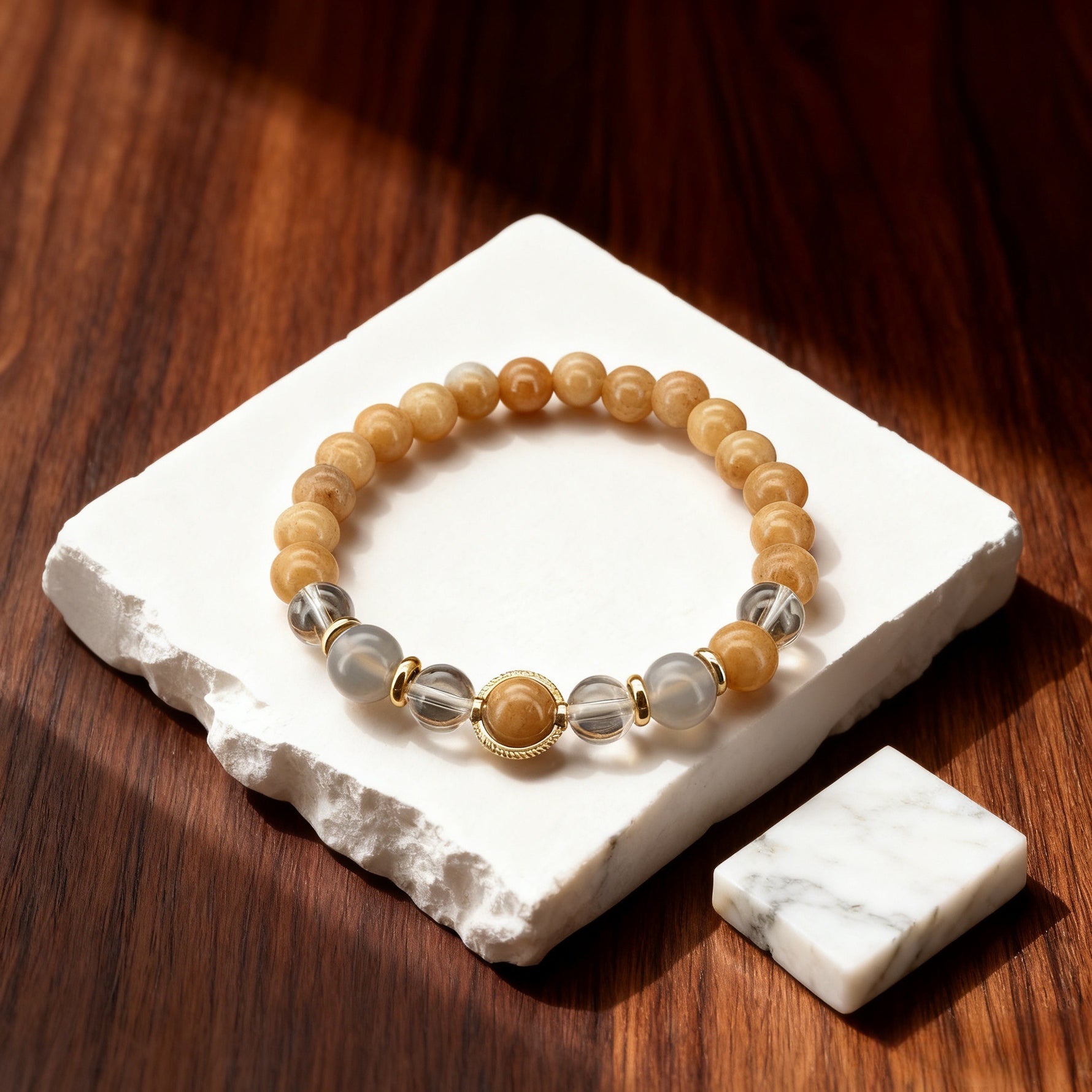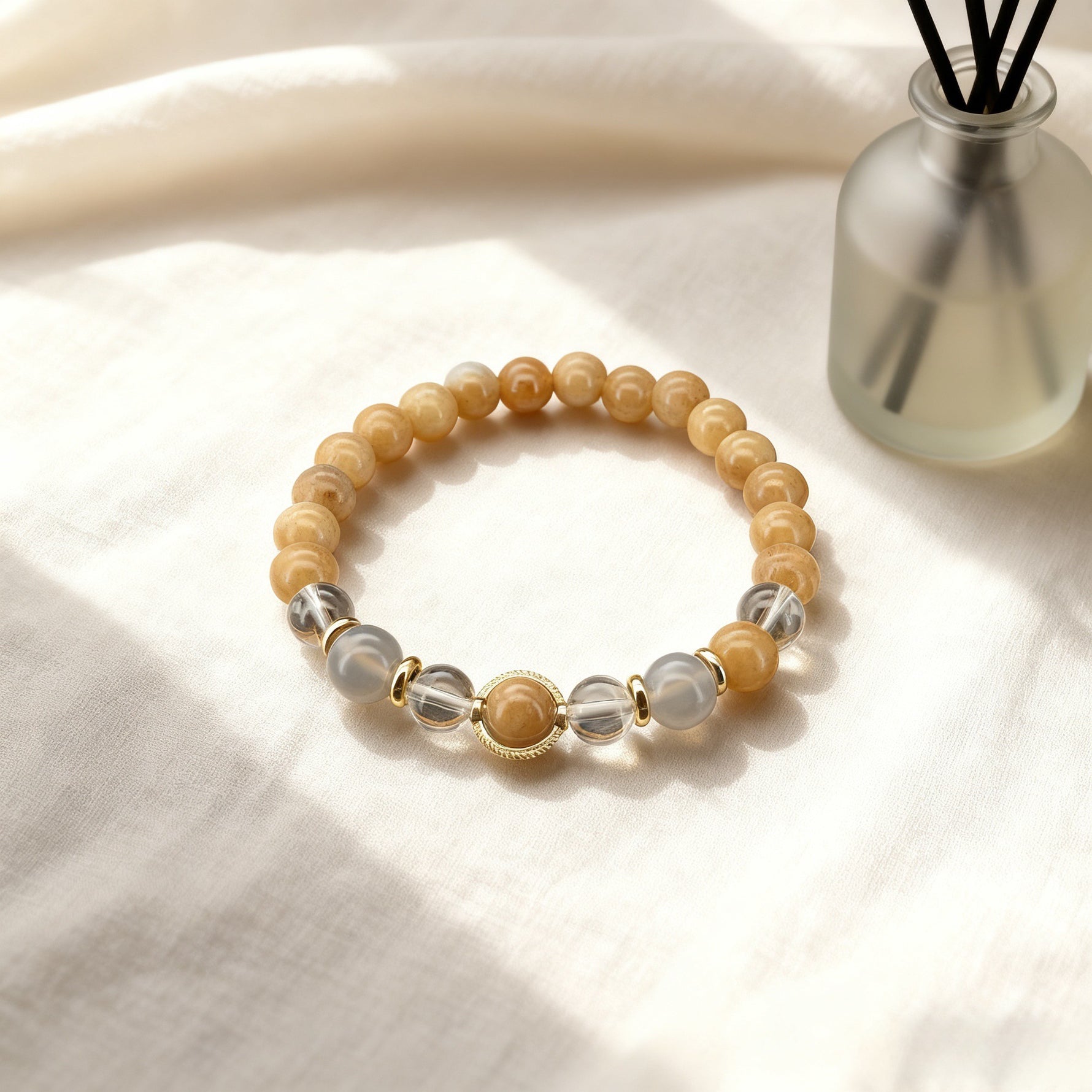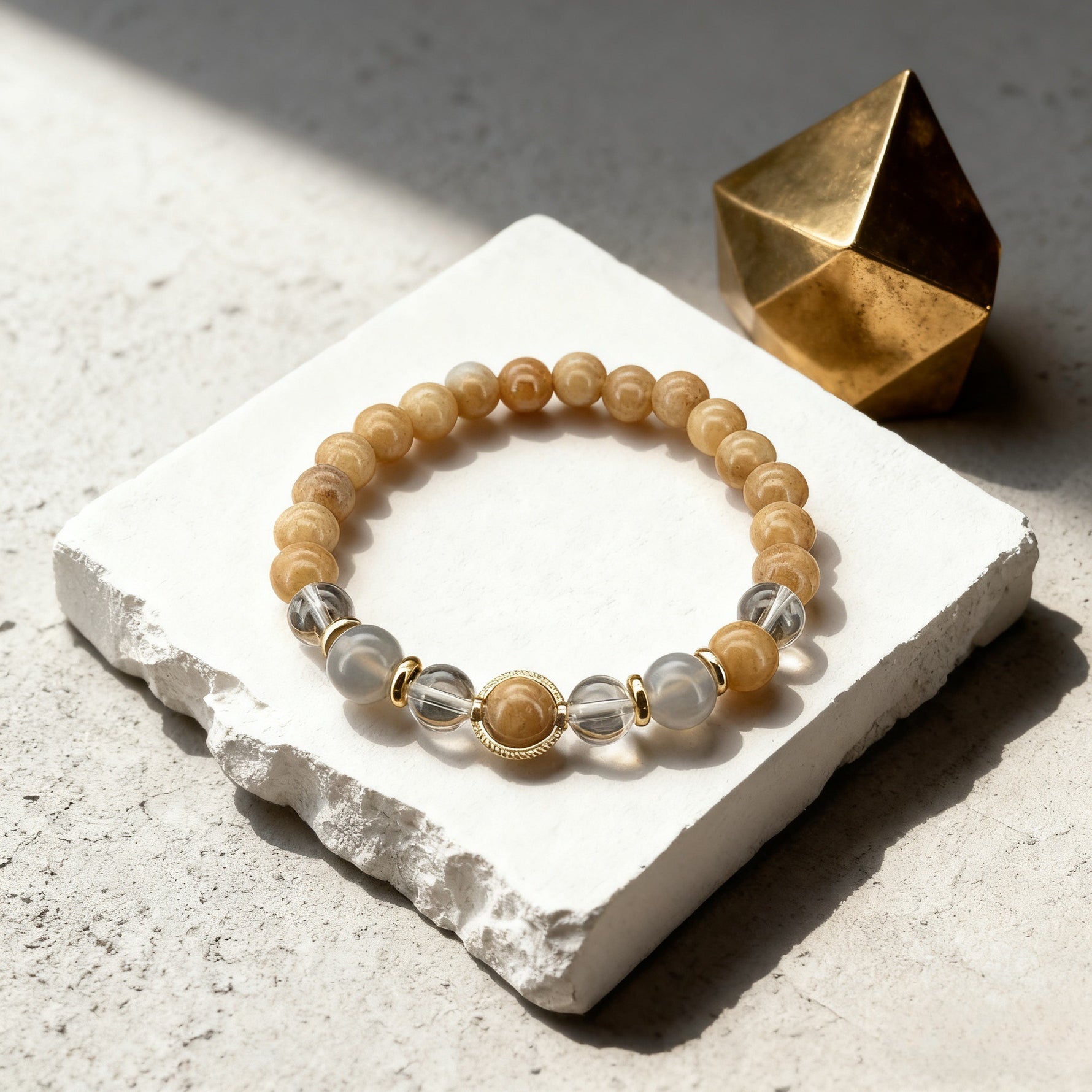 By combining Yellow Jade, Clear Quartz, and Grey Agate, this bracelet creates a potent energy field for wealth manifestation. The central Yellow Jade, encircled by a golden energy ring, symbolizes the convergence of financial resources—amplifying your ability to attract prosperity, opportunities, and monetary growth. It clears mental blocks around wealth, supports confident financial choices, and balances the energy of giving and receiving abundance.