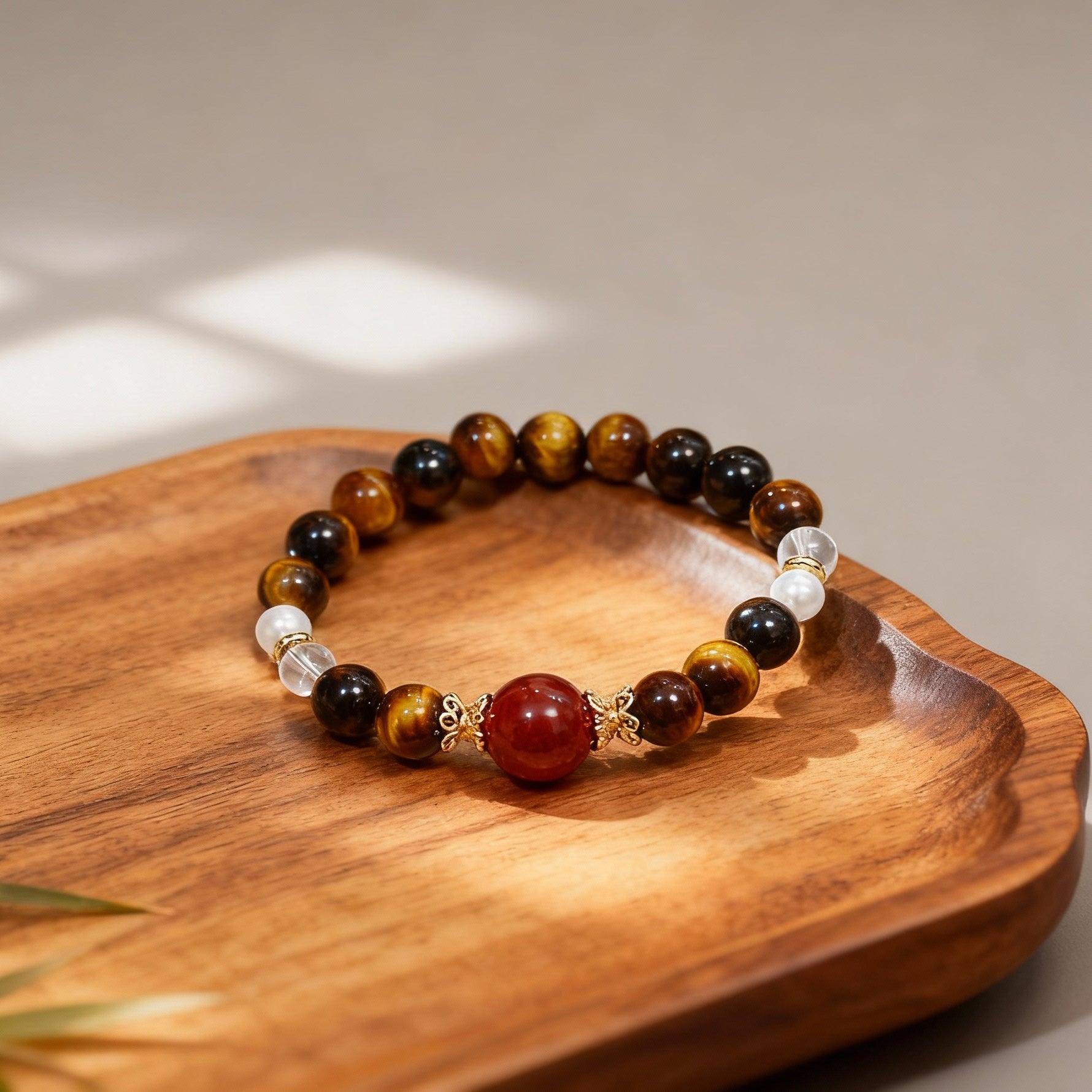 Due to the natural nature of tiger eye, red agate, pearl, and clear quartz, each bracelet is uniquely one-of-a-kind—your piece will feature slight variations in color, pattern, and pearl luster that make it exclusively yours. To preserve its luster and energetic potency, avoid exposure to water, harsh chemicals, and heavy impacts. Embrace the blend of bold confidence, vibrant vitality, and timeless elegance that your personalized bracelet embodies, and let it be a daily reminder of your strength, ambition, and magnetic charm.