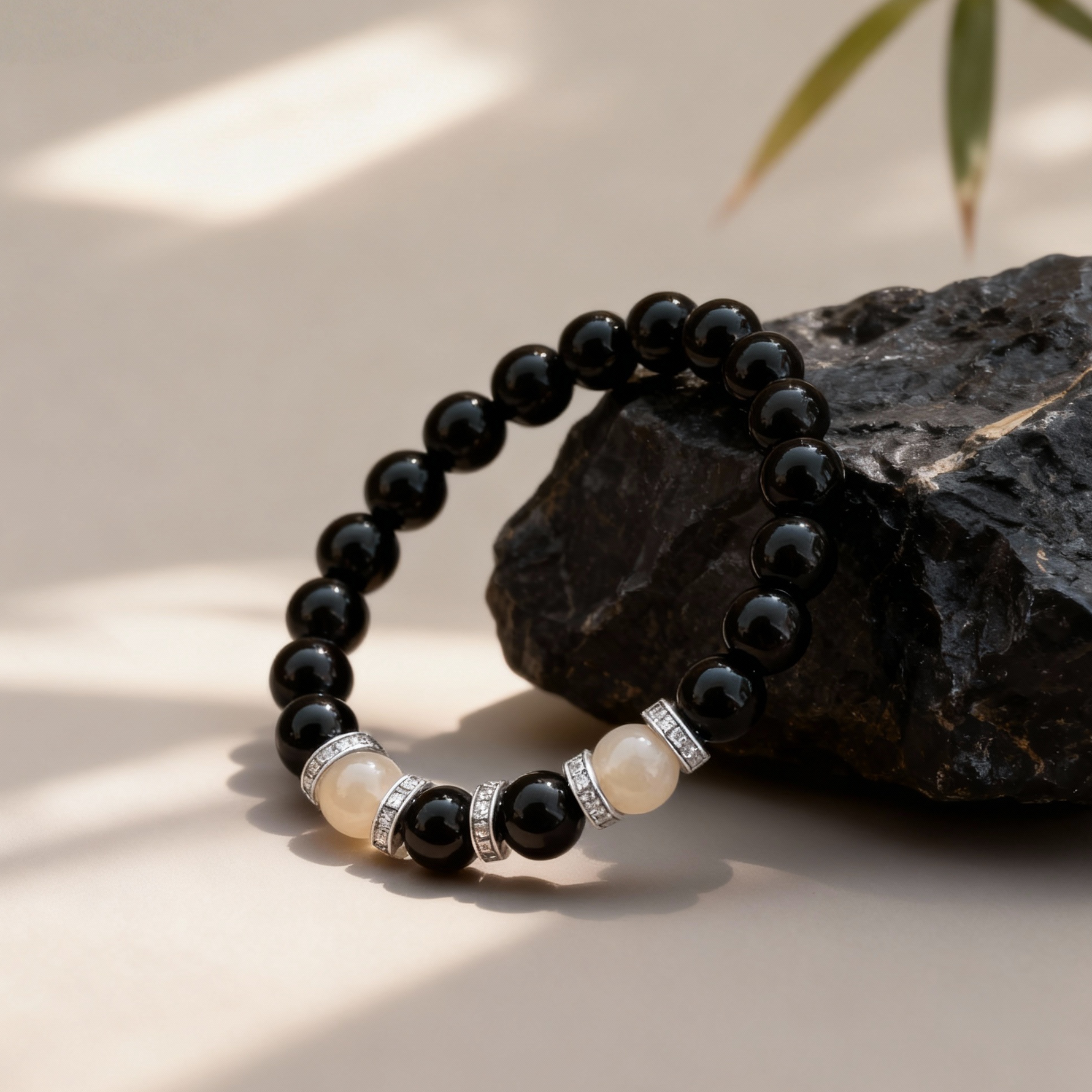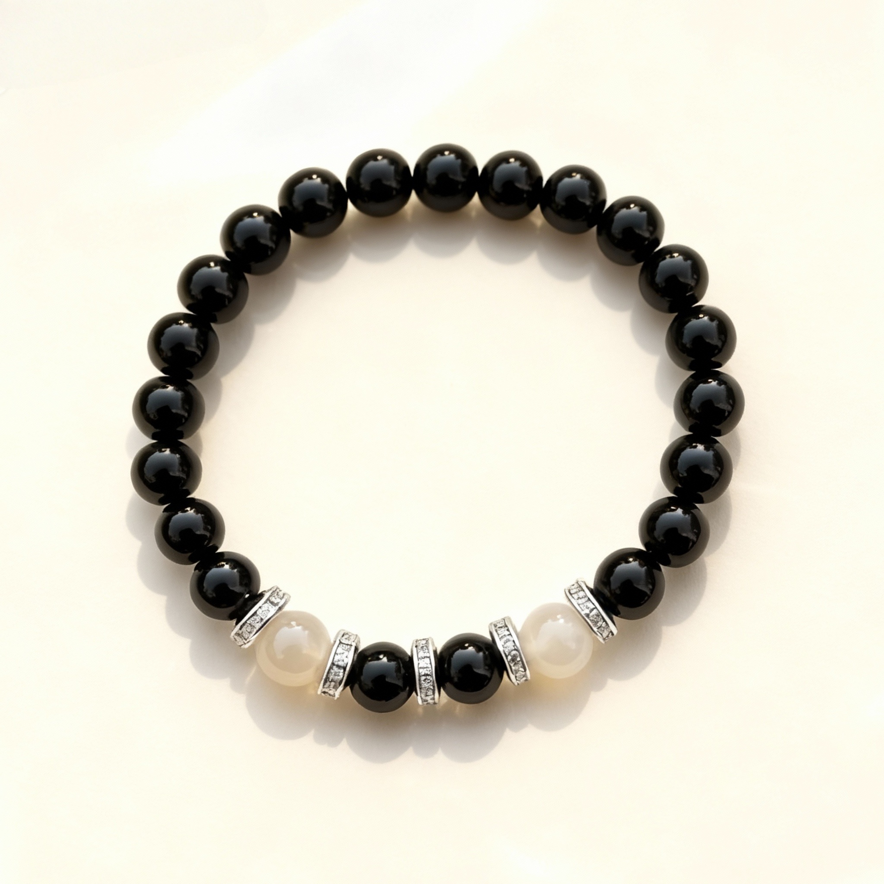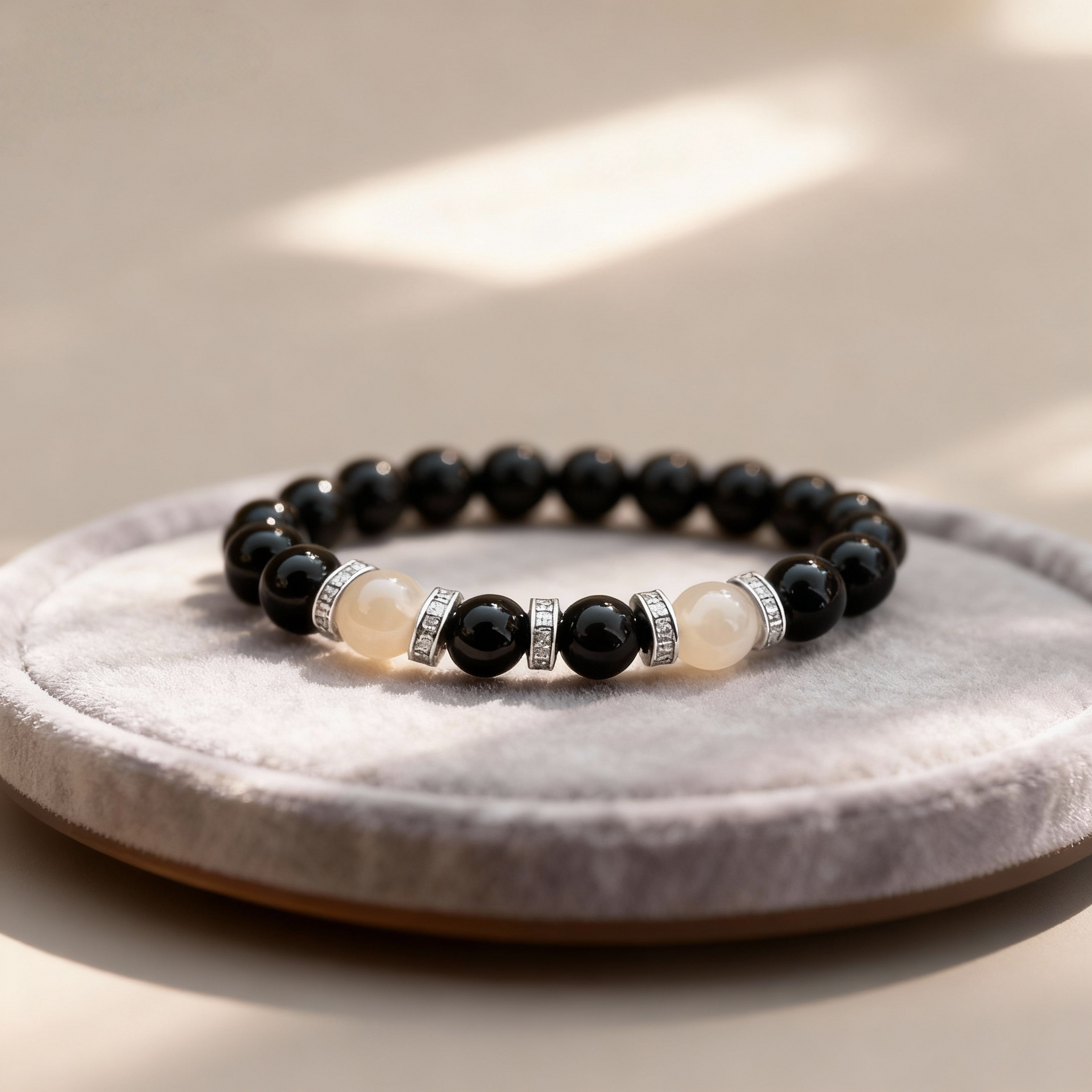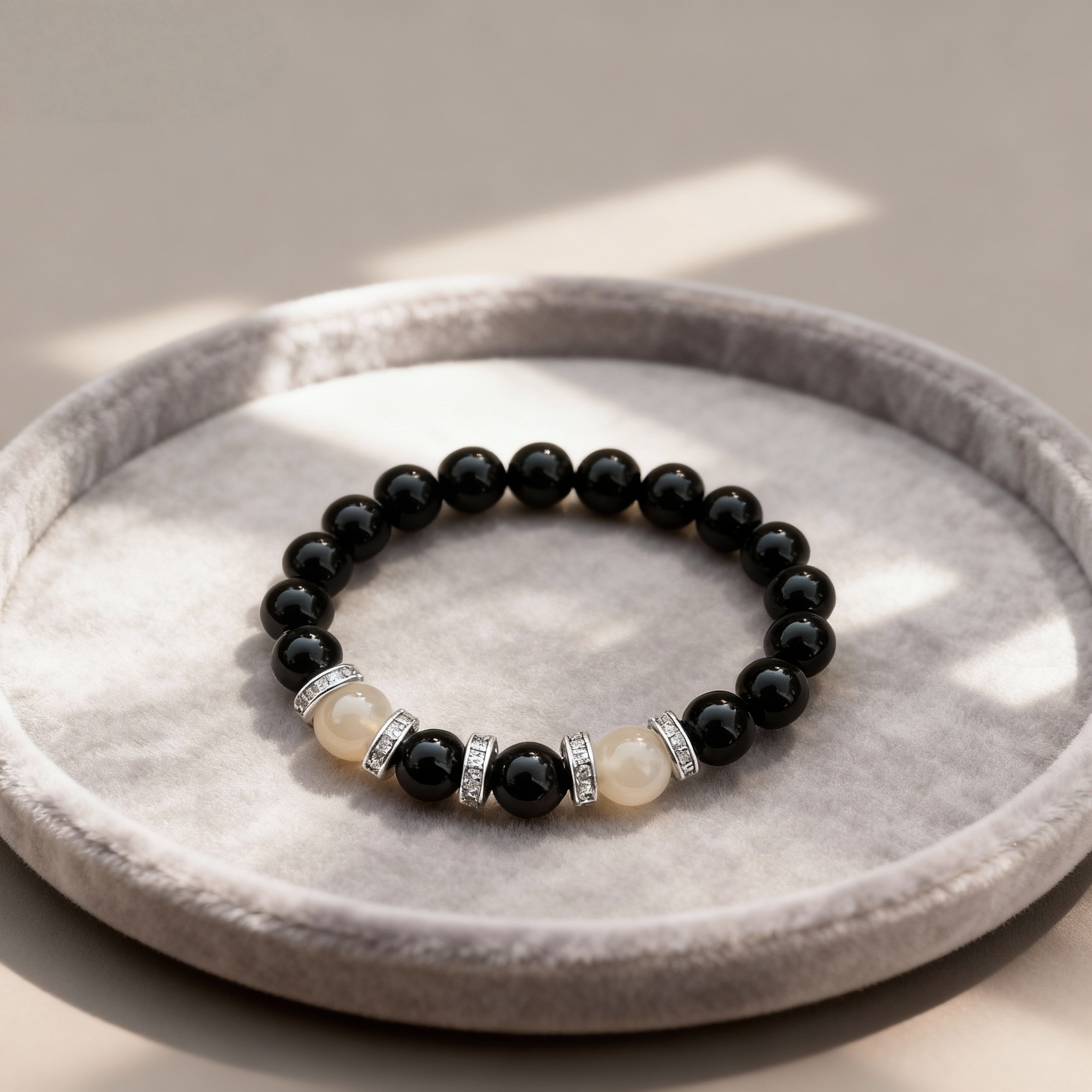 This bracelet is a masterclass in protection and balance. Obsidian deflects negativity and cleanses your energy field, while grey agate nurtures emotional stability and inner peace. The monochromatic black-and-grey palette is effortlessly chic, fitting into both casual and refined wardrobes. Whether you’re navigating a stressful day, seeking mental clarity, or aiming for a polished look, it empowers you with a sense of security, calm, and timeless style.