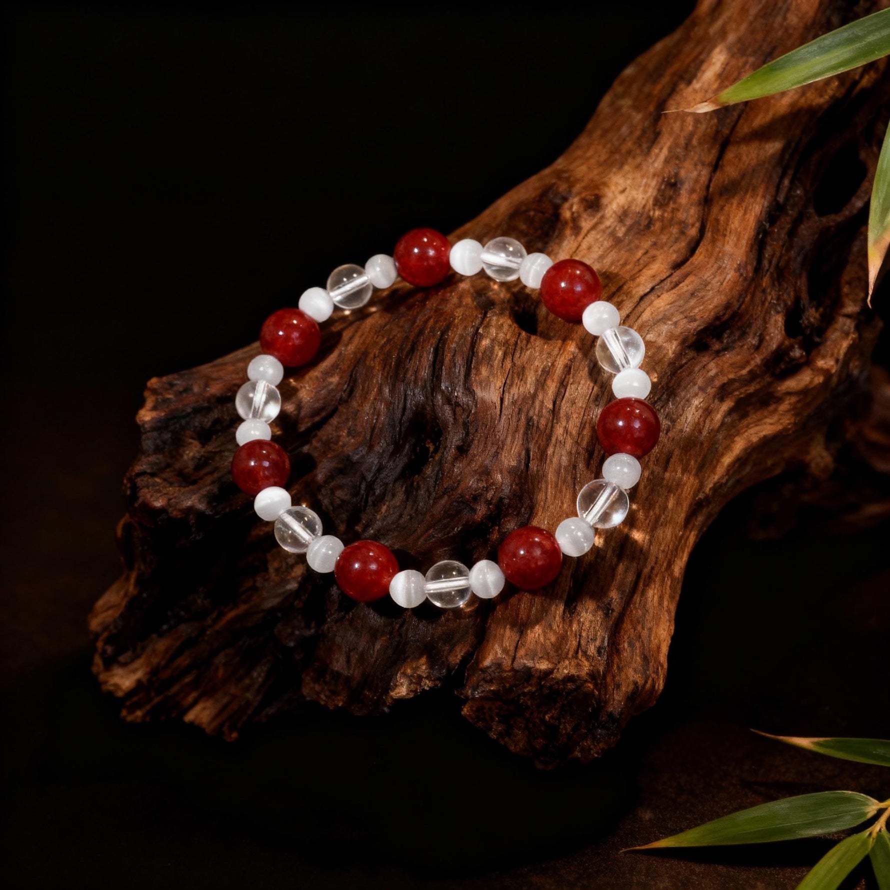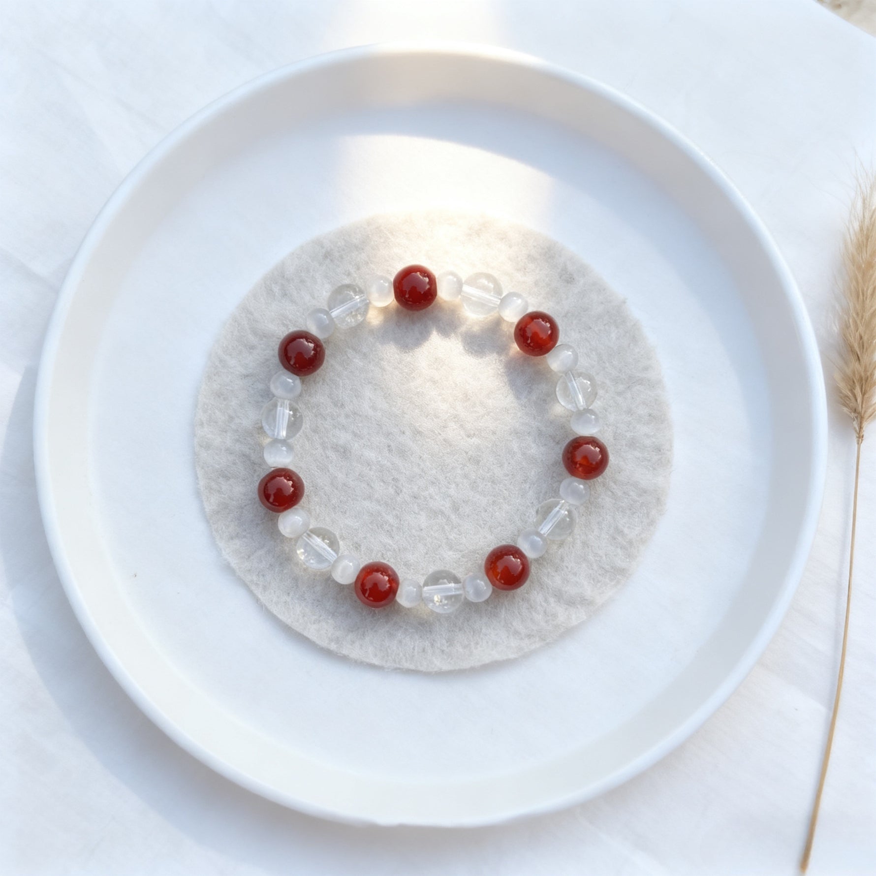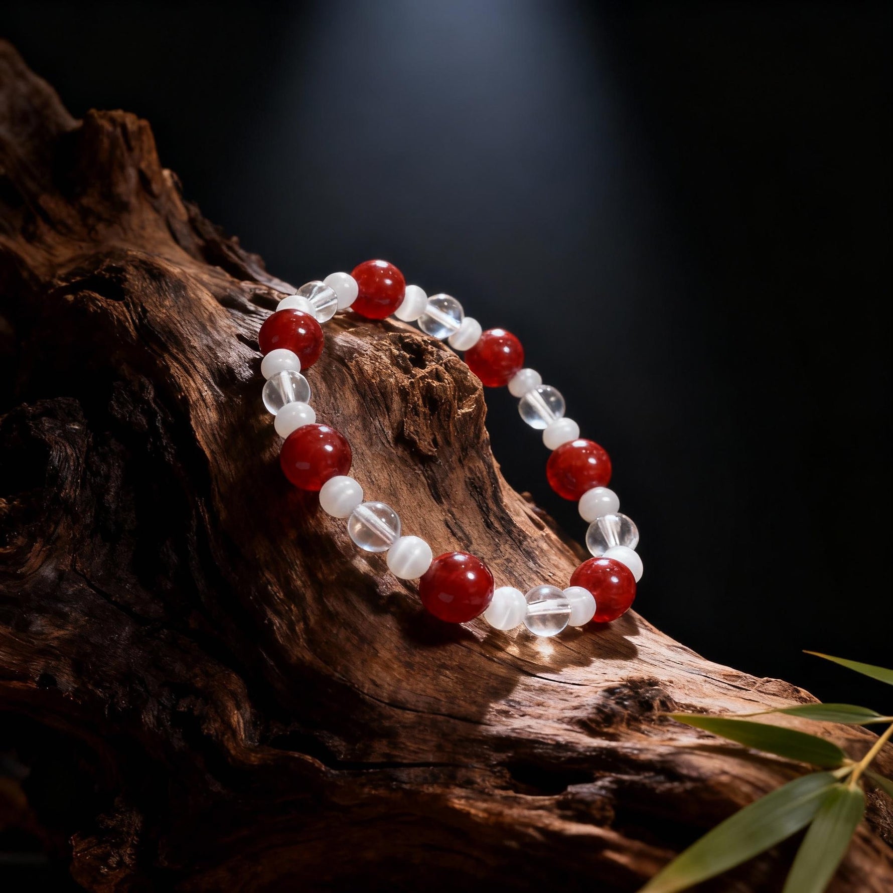 • Related Terms: red agate clear quartz bracelet, cat's eye jewelry, women’s vitality bracelet, clarity crystal jewelry, feminine gemstone bracelet
