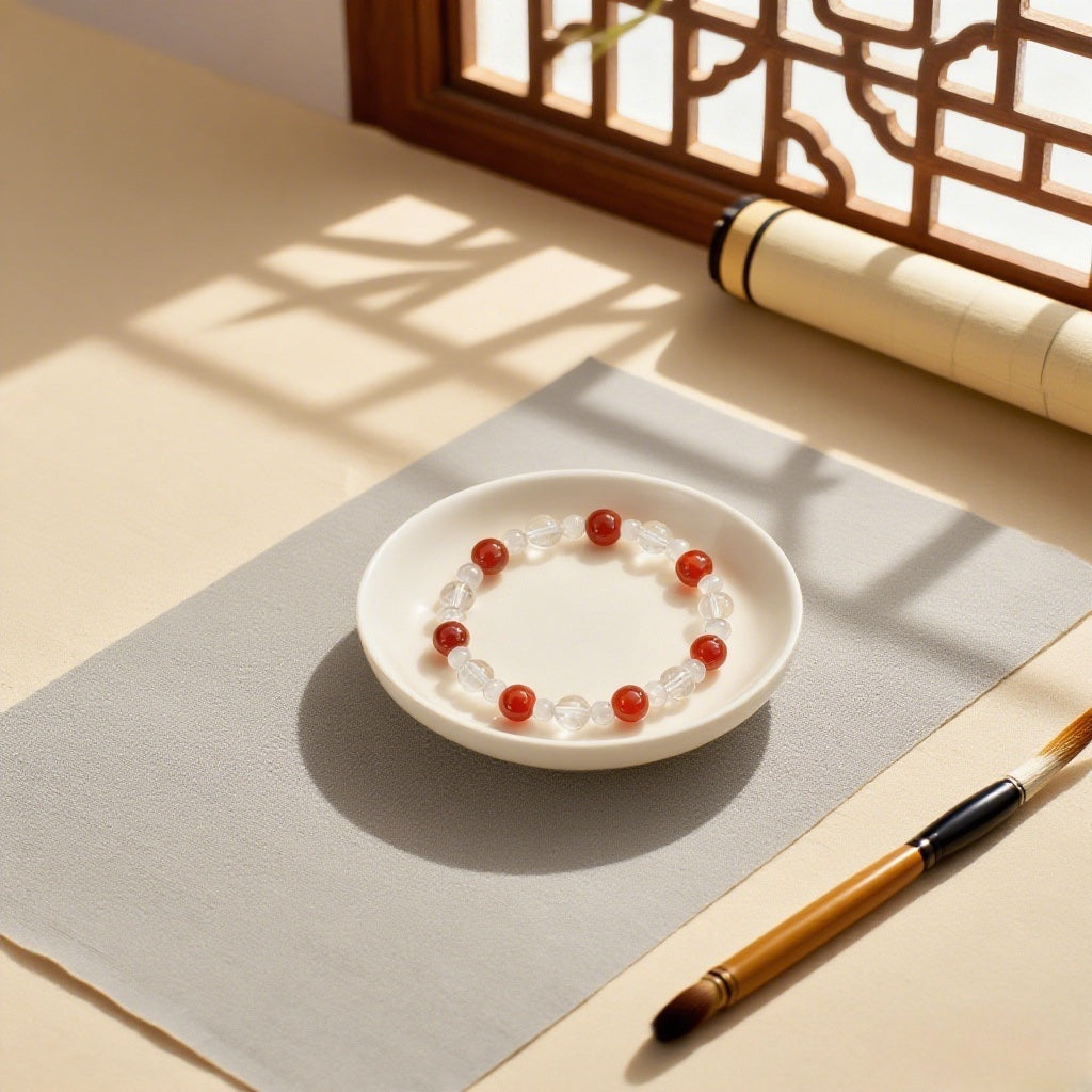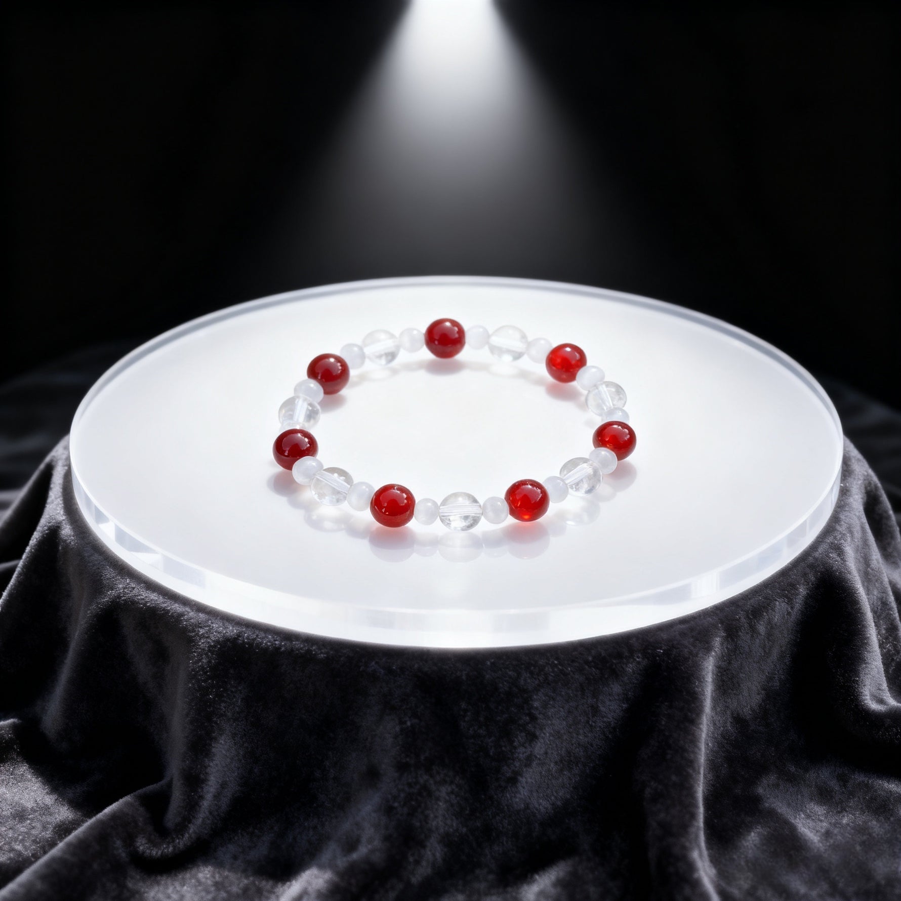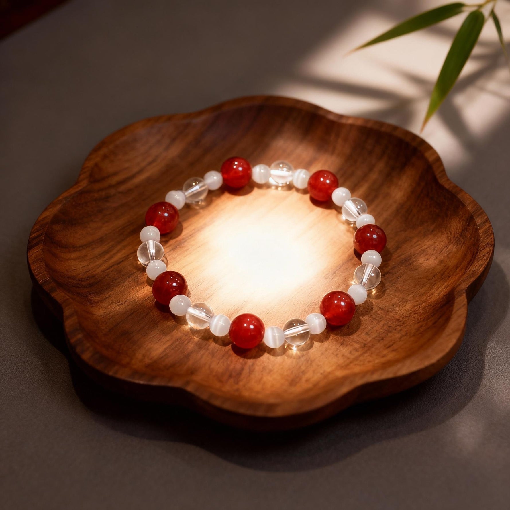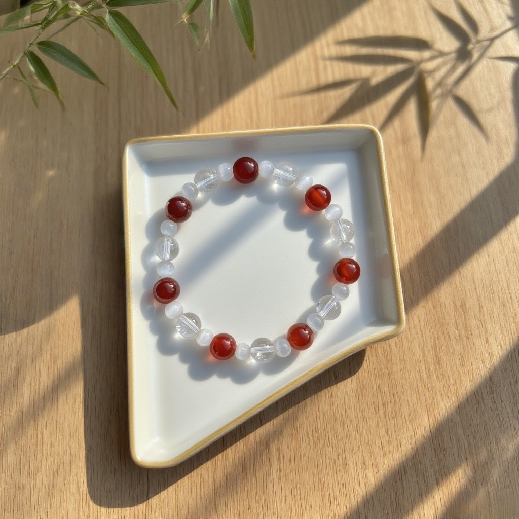 • Related Terms: red agate clear quartz bracelet, cat's eye jewelry, women’s vitality bracelet, clarity crystal jewelry, feminine gemstone bracelet